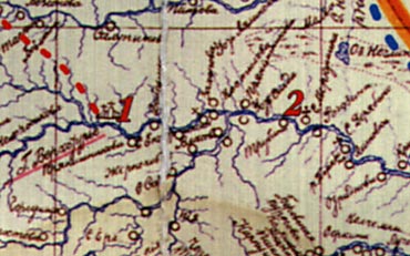 De rode stippellijn is ongeveer het oude Babinov-trakt, waarlangs de emigranten in de 17e eeuw het gebied bereikten afkomend uit Europees Rusland, de regio Solikamsk - waartussen bij de karren en het vee ook meeliep: SIMEON, adellijke jongeman, met een goede reden om zijn ouderlijk huis te verlaten. Nu de Heilige Simeon "van Verchoturje"
